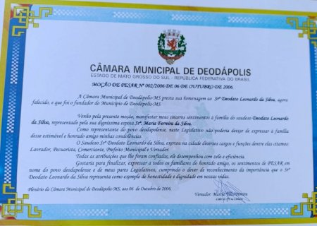A oficialização da cidade de Deodápolis se deu pela Lei Estadual nº 3690, de 13 de maio de 1976, desmembrando-se de Glória de Dourados. A emancipação foi um marco histórico, selando com justiça o reconhecimento a décadas de luta e trabalho de Deodato e de tantos outros pioneiros que compartilharam de seu sonho.